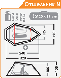 Габаритные размеры внутренней палатки, см (l x b x h) : 240 х 135 х 100