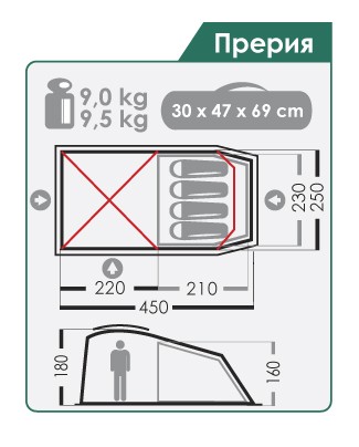 Габаритные размеры внутренней палатки, см (l x b x h) : 230x220x180
