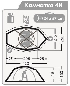 Габаритные размеры внутренней палатки, см (l x b x h) : 205 х 215 х 118