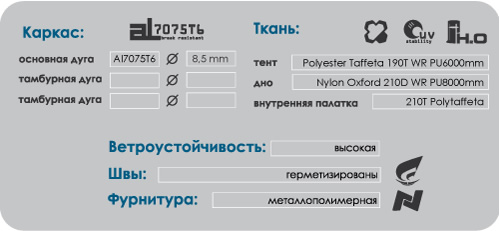 Система сквозной вентиляции. Вместительный тамбур с двумя входами. Защитные планки "молний" тента. Штормовые оттяжки. Антимоскитная сетка на входах и вентиляционных окнах внутренней палатки. Герметичное дно. Боковые карманы. Петли для фонарика во внутренней палатке и в тамбуре тента.