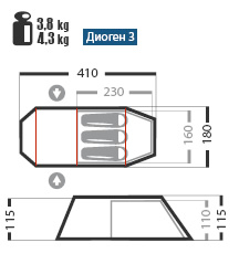 Габаритные размеры внутренней палатки, см (l x b x h) : 230 х 160 х 110